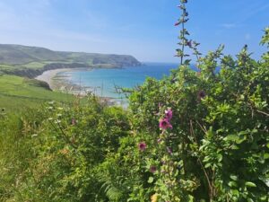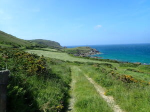 Na ongeveer een kilometer begonnen de heuvels al. Het was zwaar maar wel heel erg mooi. Qua natuur het mooiste gedeelte van de GR223. Na heel wat op en neer kwamen we langs een redelijk volle parkeerplaats. Het was duidelijk Pinksterweekend. Vanaf de parkeerplaats ging het stevig omhoog tot we bij Pointe Jobourg kwamen.