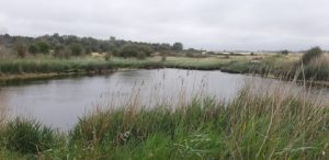 Daar werd het weer droog maar de wind bleef hard waaien. Bij een monument vonden we een bankje in de luwte om te lunchen. De rest van de dag bleef het droog. Wij bleven de kust bijna steeds volgen.