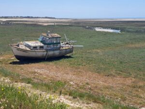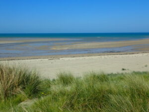 Na een goede nachtrust hadden we een niet typisch Frans ontbijt. Het was een stevig ontbijt met stevig brood. Tijdens het ontbijt hadden we een heel gesprek met gastvrouw. Na vertrek zijn we eerst langs de bakker en de epicerie gelopen voor lunchinkopen. Het was een zonnige dag en wat warmer, ruim 20 graden en wat minder wind. Het eerste gedeelte van de etappe ging langs de boulevard van Pirou Plage.