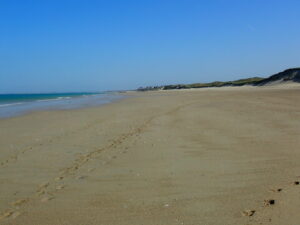 Aan het einde van het dorp ging de GR223 de duinen in over een pad met mul zand. We besloten daarom weer een stukje over het strand te lopen. Dat bleek heel zwaar te zijn omdat met elke stap een stuk in het zand wegzakten. We besloten bij de volgende strandopgang toch maar weer via de officiële route door de duinen te lopen. Ook dat was zwaar vanwege stukken mul zand en enkele heuvels.