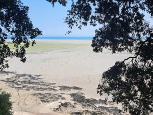 We liepen eerst een flink aantal kilometers door polderland. Vervolgens hadden we een flink aantal kilometers langs de kust met aan de ene kant een vrij drukke weg en een hele reeks dorpjes en aan de andere kant de kust. Bij Hirel was een grote picknickplaats waar wij onze eerste lunchstop inlasten. Na Vilda la Marine zouden we zo’n 4 km langs een drukke weg moeten lopen. De route ging even achter een camping langs. Wij besloten daar het pad dichter langs de kust te blijven volgen, zodat we geen last hadden van verkeerslawaai.