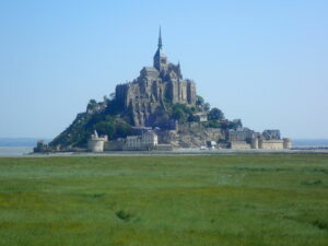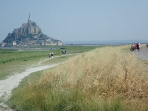 Op een gegeven moment waren we hemelsbreed slechts een kilometer verwijderd van Mont Saint Michel. We hadden hier een goed uitzicht op de ruwe rotsachtige westkant. Daarna liepen we steeds verder weg van Mont Saint Michel. Op een mooi schuin plekje hebben we in het gras gezeten voor onze lunch.