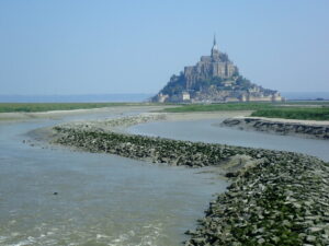 Vanaf La Rive liepen we via de GR223 naar de toegangsweg naar Mont Saint Michel en kwamen we op dit punt op de GR34. Wat lag Mont Saint Michel er mooi bij. Bij de toegangsweg naar Mont Saint Michel staken we via een brug de rivier Couesnon over. Daarna volgde een kilometers lange vrij saaie wandelroute over een dijk. Aan de kant van het binnenland lagen uitgestrekte polders. En aan de kant van de oceaan uitgestrekte grasvelden waar schapen liepen.
