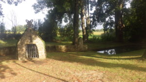 Op een gegeven moment passeerden we een oude kapel. Deze was helaas niet open. Daarna liepen we via een behoorlijk kronkelend pad verder langs de baai op richting zee. De lucht werd donkerder en het begon licht te regenen. De buienradar gaf aan dat dit van korte duur zou zijn. We vonden een mooi plekje op een gedeelte waar planken waren waar we onder de bomen op konden zitten. We hielden daar ook onze eerste lunchpauze.