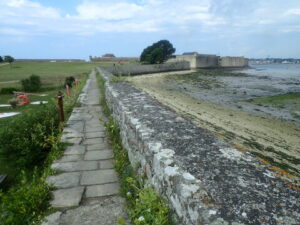 Een paar kilometer verderop bereikten we het burcht stadje Port Louis. We liepen langs de havens richting de citadel. Dit was een heel indrukwekkend fort versterkt met muren. Vervolgens liepen we verder langs de stadsmuren richting Riantec. Dit was grotendeels over het kustpad en soms even langs een verharde weg.