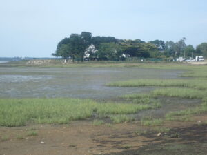 Kort voor het schiereiland Le Passage kwamen we door een schorren gebied. Wij liepen over de dijk die er dwars doorheen ging. Er waren een flinke aantal doorgangen in de dijk om eb en vloed z’n gang te laten gaan. Bij de dijk doorgangen waren bruggetjes.