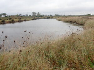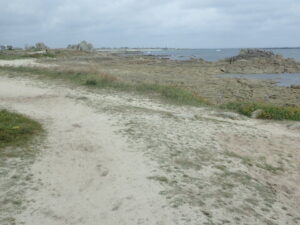 We kwamen langs Pointe de Penmarc’h en bogen daar af in oostelijke richting. Wat volgde was een afwisseling van verharde stille wegen en stukken smal kustpad. Het was heel vlak en prima te lopen. We probeerden een stukje strand. Dat was niet zo lekker lopen vanwege losse zand, dus gingen we al snel weer van het strand af. Nadat we een paar uur gelopen hadden begon het te regenen en trokken we onze regenpakken aan.
