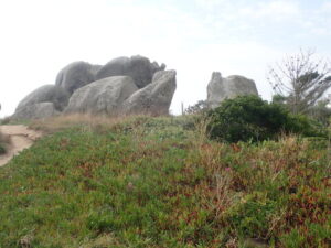 Na de lunch liepen we weer een heel stuk door duinen over goed bewandelbare paden. Net voor Loctudy passeerden we nog een aantal mooie rotsformaties bij Rocher du Gudoul. Daarna kwamen we door het dorpje Lesconil. Nadat we het dorpje verlieten en via een brug de baai overgestoken waren, waren we al snel bij de camping waar we zouden overnachten. We moesten nog enkele honderden meters doorlopen om de sleutel van de caravan op te halen.
