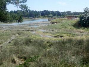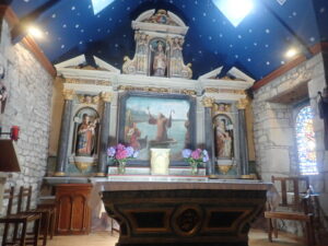 Daar wilden we verder langs het kustpad maar dat bleek afgesloten, dus moesten we meer dan een kilometer langs een hete weg lopen met weinig schaduw. In het centrum van Sint Philibert konden we terug naar de kust. Daar kwamen we langs een mooie oude kapel die we nog even bezochten.