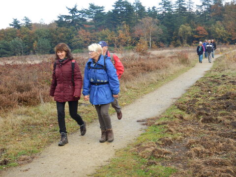 Na een heerlijke rust in het zonnetje had de wandelleider nog een klein ommetje in petto over de Groevenbeekse heide. Dat was inderdaad de moeite waard. Daarna liepen we door bosrijk gebied met af en toe een open plek richting Putten. De groep begon steeds meer zin te krijgen in het beloofde restaurant in Putten en vroeg zich meer en meer af hoe ver het nog was. Dat werd op de laatste honderden meters, toen we inmiddels Putten ingelopen waren, versterkt door de regen die steeds harder naar beneden begon te komen.