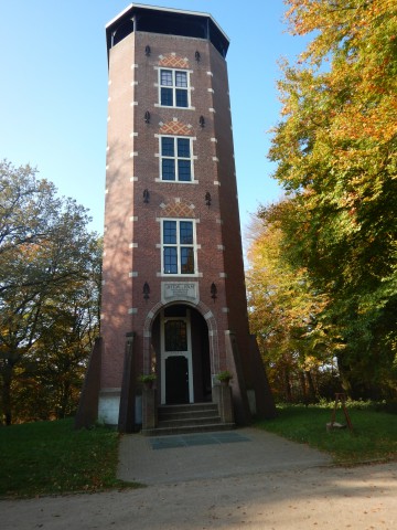 We passeerden het conferentieoord de Blije Werelt. Iets verder bereikten we de fraaie toren De Koepel bovenop de Galgenberg. Deze toren was al ruim 100 jaar oud. De toren was in deze tijd van het jaar helaas dicht. Wel was hier een mooie rustplaats met picknickbanken in de zon. Daar maakten we maar al te graag gebruik van voor onze eerste rustpauze. Na deze rustpauze was het even zoeken naar de juiste weg, omdat hier vele paden liepen en het Veluwe Zwerfpad niet overal even goed aangegeven stond. Al gauw zagen we de geel rood tekens weer, die ons naar de Lunterse Boer leiden. Maar helaas vond de wandelleiding het nog niet de tijd voor een rustpauze op het terras.