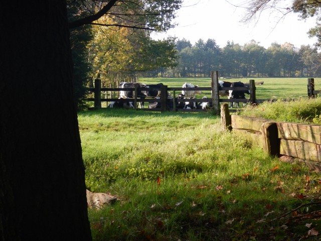 Tegen kwart voor elf waren we klaar voor vertrek van de etappe. Gelukkig was het restaurant op dit moment nog niet open, zodat niemand in verleiding gebracht werd. We begonnen op de top van de Goudsberg waar we meteen een mooi uitzicht hadden over de Gelderse Vallei. Na een klein stukje door het bos liepen we een heel stuk over een fietspad langs de bosrand, waar we mooie doorkijkjes hadden op het heuvelachtige landschap. Via enkele mooi kleine paadjes kwamen we Lunteren binnen. We passeerden het station en bereikten daarna al snel het Lunterse Buurtbos met oude bomen. Ook hier waren prachtige lichtspelingen te zien van de lage zon door het gekleurde bladerdek.