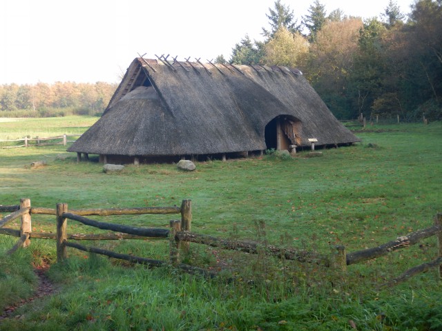 We liepen verder op de brede Boslaan. We passeerden het bungalowpark de “Droomwens”, waar het hart van een van de wandelaars sneller begon te kloppen. Niet veel verder leidde een camping ons weer in de “Rimboe” met weer stillere bospaden. Dit werd afgewisseld met enkele meer open stukken. Aan de rechterkant zagen we het heide gebied van het Wekeromse Zand. Bij de Vijfsprong was er een gereconstrueerde boerderij uit de IJzertijd. Een aantal van ons ging daar even een kijkje nemen. Ook was hier een mooie picknickplaats voor onze tweede rustpauze.