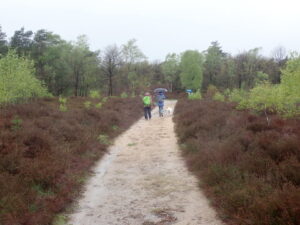 Aangezien het weer lichtjes begon te regen hebben we deze pauze kort gehouden. Sommige gingen toch op de zitmapjes op de grond zitten terwijl anderen bleven staan. Na de lunchpauze liepen we richting een prachtig heidegebied. Hier werden we getrakteerd op een flinke bui en een behoorlijke tegenwind. De paadjes waren uitgesleten en stonden vol met water. Dus moesten we over het veel ruwere terrein net naast de paadjes lopen om zo onze voeten toch enigszins droog te houden. Ondanks de regen genoten we toch van dit mooie uitgestrekte heidegebied.