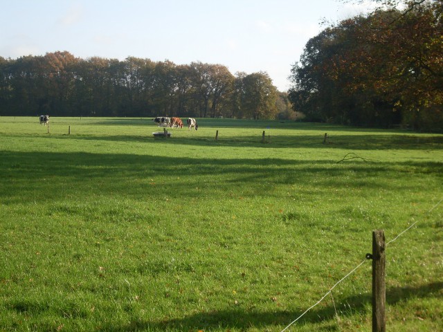 Gijs en Anja hadden de eerste paar kilometers van de route wat aangepast om zo over prachtige paadjes door het Enkdorp te kunnen lopen. Dit was echt de moeite waard. Door de zon en de fraaie herfstkleuren waren de doorkijkjes extra mooi. Nadat we een paar kilometer verder weer op de officiële route kwamen liepen we langs een smal recht pad met een fraaie bomenrij langs paardenweitjes. Aan het einde van dit pad gingen we linksaf langs een asfaltweg.