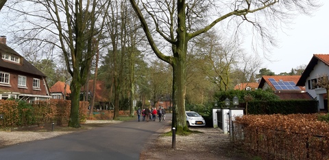 Na een kopje koffie of thee en de dagopening hebben de chauffeurs eerst de auto’s weggebracht naar het eindpunt in Hoog Soeren. Ze kwamen met twee auto’s weer terug. Daarna begonnen we op deze dag vanaf het huis van Gijs en Anja te lopen. We liepen eerst nog een stukje door de woonwijk. Als snel moesten we een eerste heuvel op en liepen we zo de wijk uit. De wandelleider liep even een stukje voorop zodat hij van de top van de heuvel iedereen op de foto kon zetten.