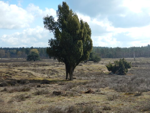 We liepen weer verder door het heidegebied gevolgd door een stuk bos en opnieuw een heidegebied. We passeerden hier ook enkele fraaie jeneverbes struiken. De magen begonnen inmiddels te rammelen, maar de wandelleider had een beter plekje voor de lunch voor ogen, dus toch nog maar even doorlopen.