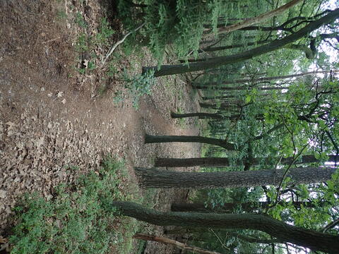 Na onze lunch liepen we nog een paar kilometer of brede bospaden, totdat we het mooiste deel van de etappe bereikten. We moesten hier in ganzepas een paar kilometer over een nogal heuvelachtig en zeer kronkelig pad, dat over een smalle heuvelrug ging. Op een gegeven moment liepen we meer dan twintig meter hoger dan het omliggend gebied. We hoorden de woorden “hoogtevrees” al in de groep vallen. Daarna volgde er toch wel een paar afdalingen die voor sommigen de nodige uitdagingen bezorgden. Maar het was de moeite waard en een plek om nog eens naar terug te keren.