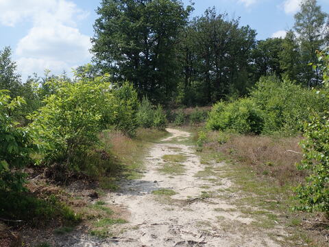 Rond half elf vertrokken we voor onze etappe. De eerste honderden meters gingen over een fietspad. We moesten daar toch even goed opletten voor de snelle jongens, racefietsen en e-bikes. Daarna zijn we nog even langs de Woeste Hoefweg gelopen, alvorens we het bos indoken. De eerste kilometers gingen over een prima begaanbaar bospad door een niet al te dicht bos. Het bos was echt prachtig groen. Dit was een ideaal stuk voor enkele diepgaande gesprekken.
